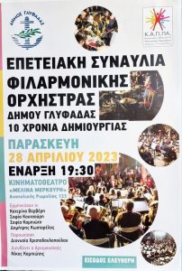 Στις 28 Απριλίου η Φιλαρμονική Ορχήστρα του Δήμου με αφορμή τη συμπλήρωση 10 ετών από την ίδρυσή της, στις 7:30 μ.μ. διοργανώνει μεγάλη επετειακή συναυλία, με ελεύθερη είσοδο για το κοινό στο Κινηματοθέατρο «Μελίνα Μερκούρη» (Ανατολικής Ρωμυλίας 123).Η δημοτική Αρχή και προσωπικά ο δήμαρχος Γιώργος Παπανικολάου στηρίζει αμέριστα τις προσπάθειες των μελών της Φιλαρμονικής, που είναι επιλεγμένα με αυστηρά κριτήρια και αποτελούν μία ομάδα κόσμημα για την πόλη.