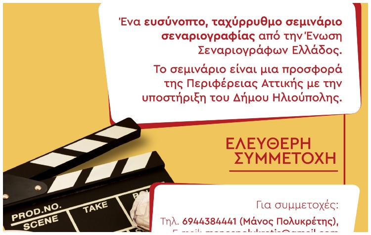 Το σεμινάριο, το οποίο προσφέρεται δωρεάν στους δημότες από καταξιωμένα μέλη της Ένωσης Σεναριογράφων, θα πραγματοποιηθεί στο Κλειστό Δημοτικό Θέατρο Ηλιούπολης «Μίκης Θεοδωράκης».