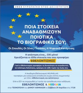 Η Ακαδημία Εθελοντισμού HelpHellas στο πλαίσιο των θεματικών ημερίδων που διοργανώνει για τον Εθελοντισμό, διοργανώνει νέα εσπερίδα με θέμα: “ΕΘΕΛΟΝΤΙΣΜΟΣ και ΝΕΟΛΑΙΑ” το Σάββατο 29 Απριλίου 2023 στις 17.30 μμ στην Τεχνόπολη Δήμου Αθηναίων, που απευθύνεται σε μαθητές Γυμνασίων, Λυκείων, Φοιτητές και γονείς, προκειμένου να παρουσιάσει τις προτάσεις και το πρόγραμμα της για την προώθηση του εθελοντισμού στο χώρο της Πρωτοβάθμιας και Δευτεροβάθμιας Εκπαίδευσης, αλλά και στα Πανεπιστήμια.