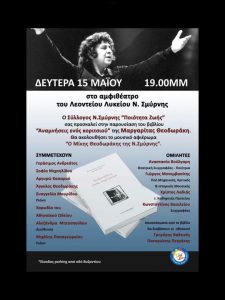 Εκδήλωση – αφιέρωμα στη μνήμη του Μίκη Θεοδωράκη διοργανώνει τη Δευτέρα 15 Μαΐου 2023 ο Σύλλογος Νέας Σμύρνης «Ποιότητα Ζωής», που παρουσιάζει στις 7:00μμ στο Μεγάλο Αμφιθέατρο του Λεοντείου Λυκείου Νέας Σμύρνης ( Σοφούλη 2 Νέα Σμύρνη ) το βιβλίο της Μαργαρίτας Θεοδωράκη «Αναμνήσεις ενός κοριτσιού» ( Εκδόσεις Ιανός ).