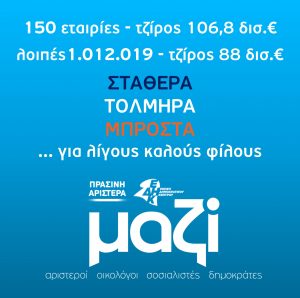Για “150 εταιρείες που πραγματοποίησαν τζίρο 106,8 δισ.€ όταν οι υπόλοιπες 1.012.019 πραγματοποίησαν 88 δισ.€” κάνει λόγο σε δελτίο τύπου που εξέδωσε το Γραφείο Τύπου του συνδυασμού Πράσινη Αριστερά – ΜΑΖΙ, ο οποίος επισημαίνει χαρακτηριστικά ότι “στην χώρα του ΑΕΠ των 190 δισ.€, θησαυρίζουν οι λίγοι.