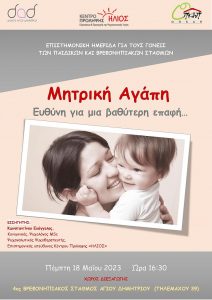 Την Πέμπτη 18 Μαΐου 2023 και ώρα 16:30, στον 4ο Βρεφονηπιακό Σταθμό Αγίου Δημητρίου (Τηλεμάχου 39), θα διεξαχθεί η 2η Επιστημονική Ημερίδα για τους γονείς των Παιδικών και Βρεφονηπιακών Σταθμών με θέμα “Μητρική Αγάπη – Ευθύνη για μια βαθύτερη επαφή…”.