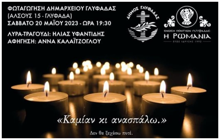 «Ημέρα εθνικής μνήμης η 19η Μαϊου και διατράνωσης του αιτήματος για διεθνή αναγνώριση της Γενοκτονίας των 353.000 Ελλήνων του Πόντου που σφαγιάστηκαν από τους Τούρκους κατά το διάστημα από το 1916 έως το 1923. Αύριο, Σάββατο 20 Μαϊου, στις 7:30 το απόγευμα το Δημαρχείο Γλυφάδας (Άλσους 15) θα φωταγωγηθεί, για τέταρτη συνεχόμενη χρονιά, στο κόκκινο του αίματος των προγόνων μας, στο πλαίσιο εκδήλωσης τιμής και μνήμης την οποία συνδιοργανώνουν ο Δήμος Γλυφάδας και η Ένωση Ποντίων Γλυφάδας «Η Ρωμανία».