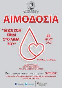 Εθελοντική αιμοδοσία διοργανώνει ο Δήμος Βύρωνα σε συνεργασία με το Νοσοκομείο Σωτηρία για την ενίσχυση της δημοτικής τράπεζας αίματος.