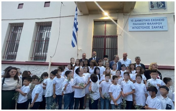 Με τα αποκαλυπτήρια της καινούριας πινακίδας καθώς και του ψηφιδωτού στην πρόσοψη του 1ου Δημοτικού Σχολείου Παλαιού Φαλήρου που απεικονίζει την ηρωική πράξη, έγινε παρουσία του δημάρχου Παλαιού Φαλήρου η τελετή συμπλήρωσης της επωνυμίας του Σχολείου σε «Σχολείο Απόστολος Σάντας».