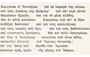 Και το ποίημα «Παλαιόθεν Ελληνίς» είναι, όπως γράψαμε, πιο πάνω βραχεία «έκφραση» της Αντιόχειας. Πράγματι, οι αναφορές στο εν λόγω ποίημα απαντούν στον Αντιοχικόν, όπως τα λαμπρά κτήρια, οι ωραίοι δρόμοι, η θαυμάσια εξοχή, το πλήθος των κατοίκων, η έδρα ενδόξων βασιλέων, οι καλλιτέχνες και οι σοφοί, οι έμποροι, οι Αργείοι, οι πρώτοι άποικοι της Αντιόχειας.