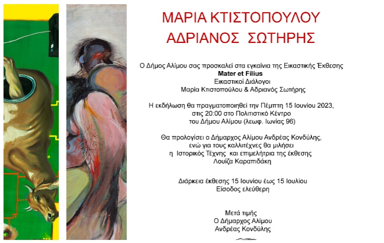 Την Πέμπτη, 15 Ιουνίου, το απόγευμα, στο Πολιτιστικό Κέντρο του Δήμου Αλίμου, θα πραγματοποιηθούν τα εγκαίνια της Εικαστικής Έκθεσης με έργα της διακεκριμένης εικαστικού Μαρίας Κτιστοπούλου και του γιου της Αδριανού Σωτήρη με «Mater et filius: εικαστικοί διάλογοι».