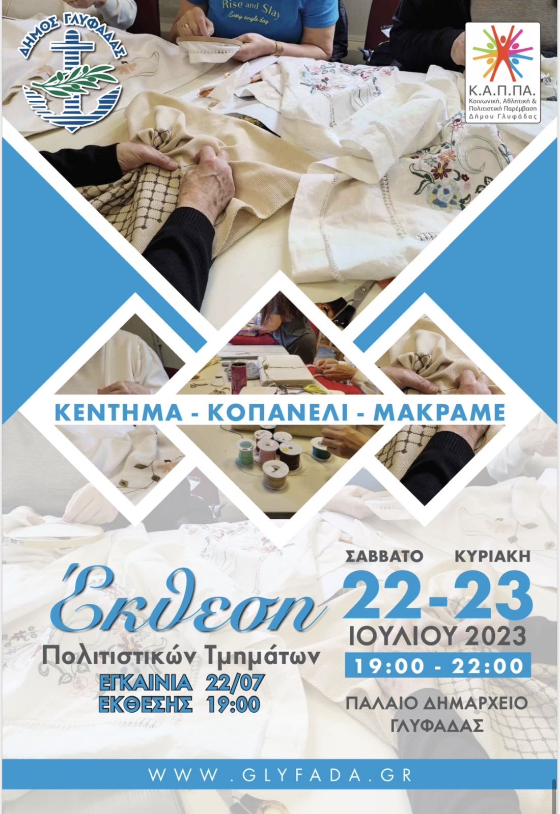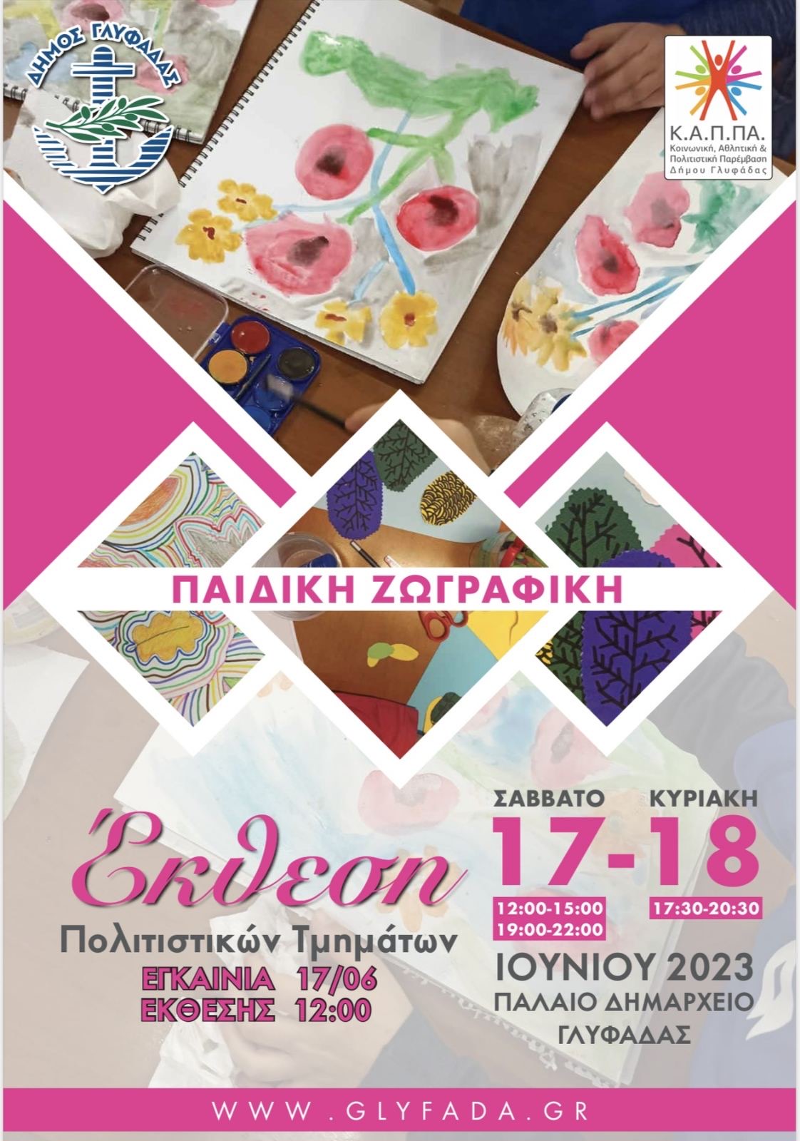 Παιδική ζωγραφική, κόσμημα, εικαστικά ενηλίκων, κέντημα – κοπανέλι – μακραμέ και θέατρο! Τέσσερις εκθέσεις στο Παλαιό Δημαρχείο (Σάκη Καράγιωργα 1 και Λ. Ποσειδώνος, απέναντι από τον Μητροπολιτικό Ναό των Αγίων Κωνσταντίνου και Ελένης) και μία θεατρική παράσταση στο Δημοτικό Κινηματοθέατρο «Μ.Μερκούρη» (Γ. Γεννηματά και Ανατ. Ρωμυλίας 123) από τα Πολιτιστικά Τμήματα της πόλης μας, κλείνουν με τον πιο όμορφο και δημιουργικό τρόπο μια χρονιά παραγωγική, γεμάτη καινούργια πράγματα για εκατοντάδες δημότες Γλυφάδας.
