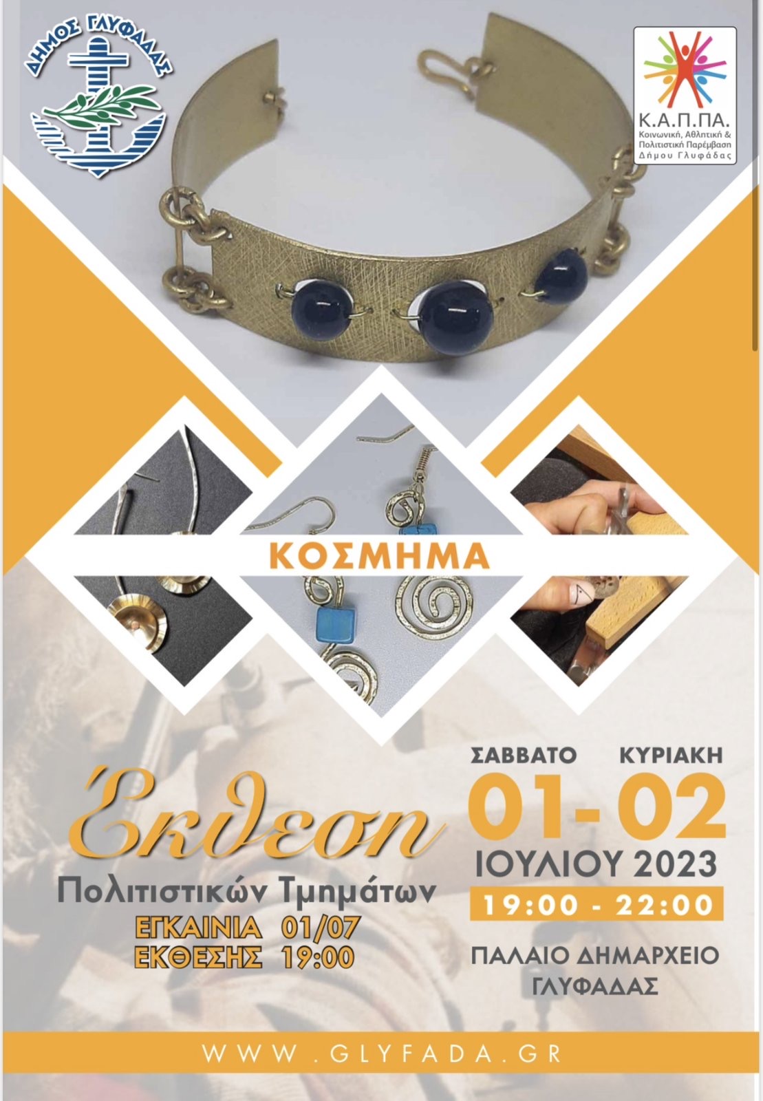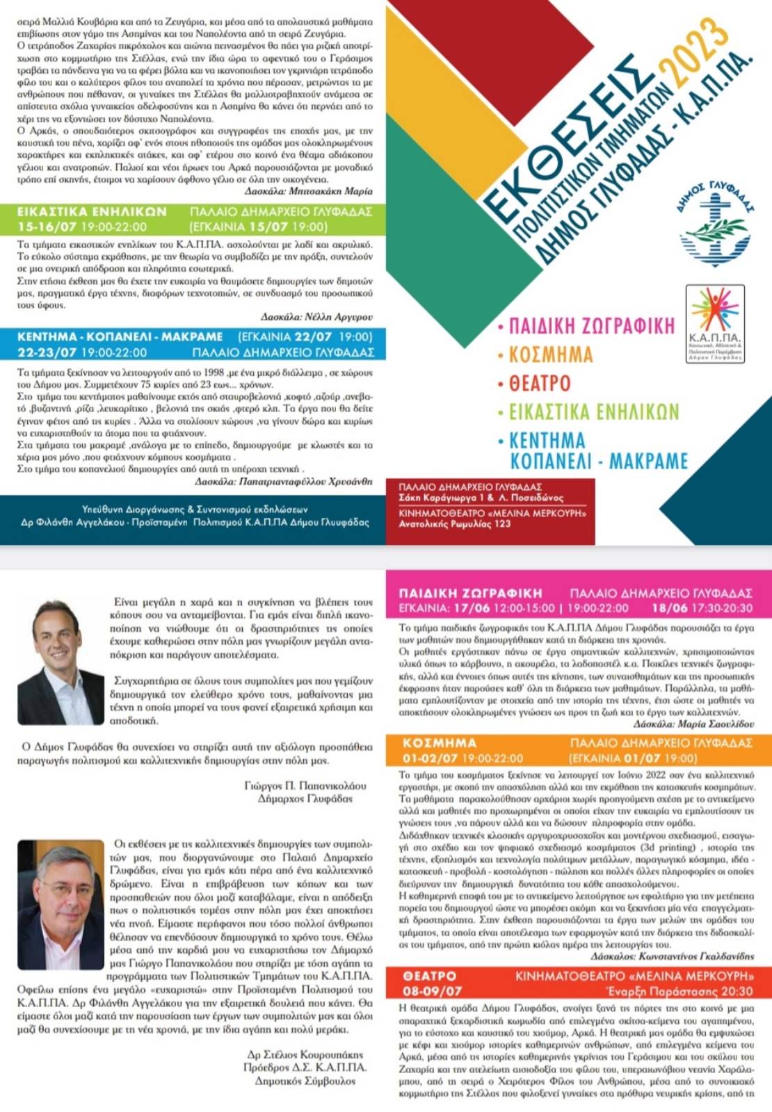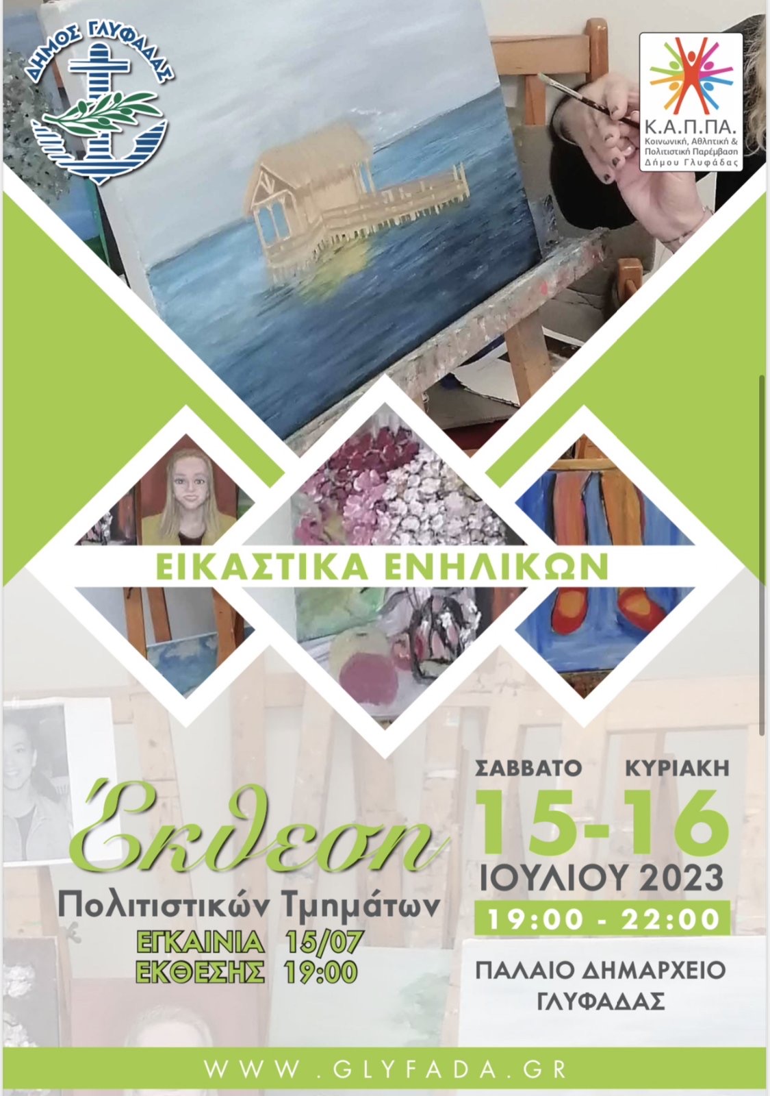 Καθ’ όλη τη διάρκεια του έτους, σχεδόν σε καθημερινή βάση, άνθρωποι από τη Γλυφάδα με κέφι και όρεξη για εκμάθηση μιας καινούργιας τέχνης, πέρασαν δημιουργικά το χρόνο τους και τώρα μας παρουσιάζουν τα έργα τους! Τα Σαββατοκύριακα του καλοκαιριού, οι μαθητές των Πολιτιστικών Τμημάτων του Κ.Α.Π.ΠΑ. εκθέτουν τις δημιουργίες τους!