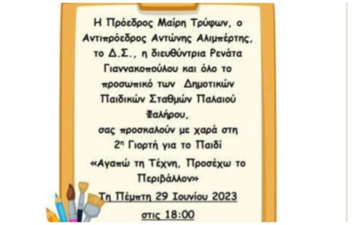 Συγκεκριμένα, ο δήμαρχος Γιάννης Φωστηρόπουλος, η πρόεδρος των Δημοτικών Παιδικών Σταθμών Μαίρη Τρύφων, ο αντιπρόεδρος Αντώνης Αλιμπέρτης, το Δ.Σ. , η διευθύντρια Ρενάτα Γιαννακοπούλου και το προσωπικό των Δημοτικών Παιδικών Σταθμών Παλαιού Φαλήρου, διοργανώνουν την 2η Γιορτή για το Παιδί: «Αγαπώ τη Τέχνη, προσέχω το Περιβάλλον», στο πάρκο Αγίου Γεωργίου στο Τροκαντερό