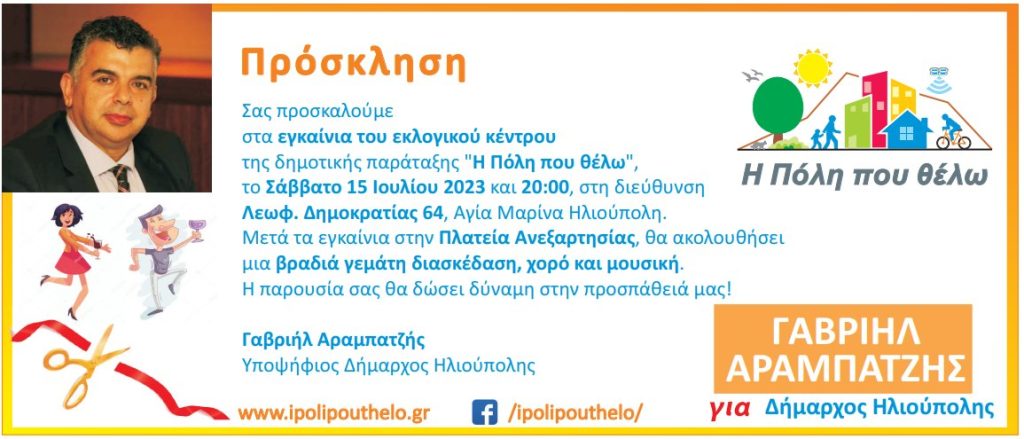 Ο υποψήφιος δήμαρχος Ηλιούπολης Γαβριήλ Αραμπατζής εγκαινιάζει το εκλογικό κέντρο της δημοτικής παράταξης “Η Πόλη που θέλω”, το Σάββατο 15 Ιουλίου 2023 και 20:00, στη Λεωφ. Δημοκρατίας 64, Αγία Μαρίνα Ηλιούπολη.