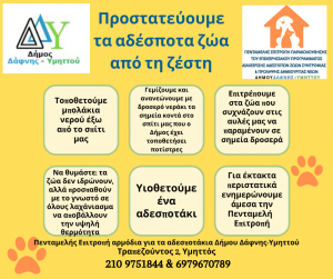 Καλώ τους Δημότες – Κατοίκους, αν εντοπίσουν στη γειτονιά τους αδέσποτο ζωάκι, να φροντίσουν να βάλουν ένα μπολάκι νερό σε σκιερό μέρος. Επίσης, αν κάποιο ζωάκι ξεκουράζεται σε σκιά, να μην το ενοχλήσουν. Σε επείγουσα ανάγκη για έκτακτα περιστατικά, ενημερώνουμε άμεσα την Πενταμελή Επιτροπή Αρμόδια για τα αδέσποτα ζώα Δήμου Δάφνης – Υμηττού. Επίσης, αν πέσει στην αντίληψή σας περιστατικό με αλυσοδεμένα δεσποζόμενα ζώα συντροφιάς, σε συνθήκες μη σκίασης και χωρίς πρόσβαση σε πόσιμο νερό, παρακαλώ όπως το αναφέρετε αμέσως στην Πενταμελή Επιτροπή Αρμόδια για τα αδέσποτα ζώα Δήμου Δάφνης – Υμηττού ή στο Αστυνομικό Τμήμα.