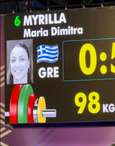 Την τιμητική 10η θέση κατέλαβε η Μαρία – Δήμητρα Μυρίλλα, αθλήτρια του Α.Σ. Ευ Αγωνίζεσθαι, που πήρε μέρος στο Ευρωπαϊκό Πρωτάθλημα U23 νέων γυναικών άρσης βαρών, στο Βουκουρέστι της Ρουμανίας.