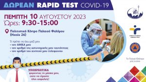 Ο Δήμος Παλαιού Φαλήρου, σε συνεργασία με τον ΕΟΔΥ, έχει προγραμματίσει και θα διενεργήσει δωρεάν rapid test COVID-19 την Πέμπτη 10 Αυγούστου από τις 9:30 π.μ. έως τις 15:00 μ.μ. στο Πολιτιστικό Κέντρο Παλαιού Φαλήρου (επί της οδού Ηχούς 26).