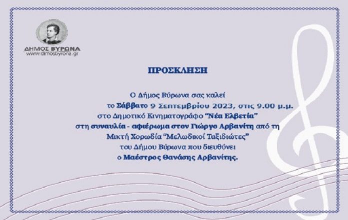 Συναυλία αφιέρωμα στον Γιώργο Αρβανίτη διοργανώνει στις 9 Σεπτεμβρίου ο Δήμος Βύρωνα, στην αίθουσα του Δημοτικού Κινηματογράφου “Νέα Ελβετία” στις 9.00 μ.μ..