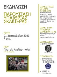 Το απόγευμα της Παρασκευής 1ης Σεπτεμβρίου, στις 19.00, θα γίνει η επίσημη παρουσίαση της υπαίθριας σκακιέρας στην πλατεία Ανεξαρτησίας, στον Άλιμο.