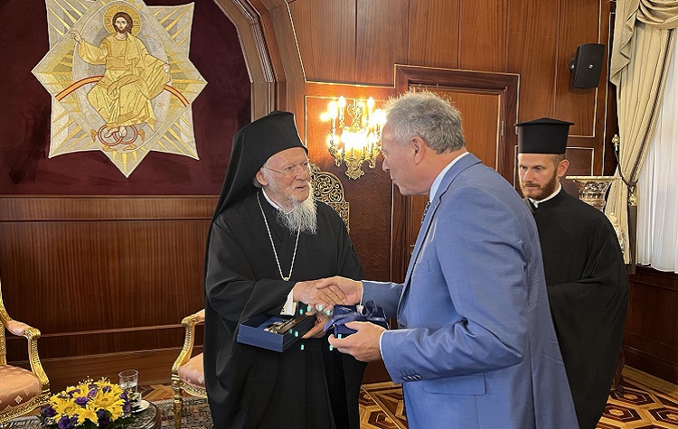Ο Γιάννης Σγουρός, ο οποίος συνοδευόταν από την Δρ. Λυδία Ιωαννίδου – Μουζάκα, επ. Καθηγήτρια της Ιατρικής Σχολής Παν/μίου Αθηνών και Πρόεδρο της Ελληνικής Εταιρείας Μαστολογίας, συνομίλησε εγκάρδια και παρέδωσε αναμνηστικό αντίγραφο αρχαίας τριήρης στον Παναγιώτατο Οικουμενικό Πατριάρχη κ. κ Βαρθολομαίο και αναμνηστικά αντίγραφα νομισμάτων της Ελληνικής Επανάστασης στον Μακαριώτατο Προκαθήμενο της Ορθόδοξής Εκκλησίας της Ουκρανίας κ. κ. Επιφάνιο.