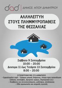 Ο Δήμος Αγίου Δημητρίου, λόγω των αυξημένων αναγκών που έχουν δημιουργηθεί από τις πρωτοφανείς πλημμύρες που έπληξαν τη χώρα και ιδιαίτερα την περιφέρεια της Θεσσαλίας, θα συγκεντρώνει: