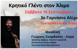 Κρητικό γλέντι με μουσική και παραδοσιακούς μεζέδες διοργανώνει ο Σύλλογος Κρητών Αλίμου “Ο Καζαντζάκης” το βράδυ του Σαββάτου 16 Σεπτεμβρίου στο προαύλιο του 3ου Γυμνασίου Αλίμου.