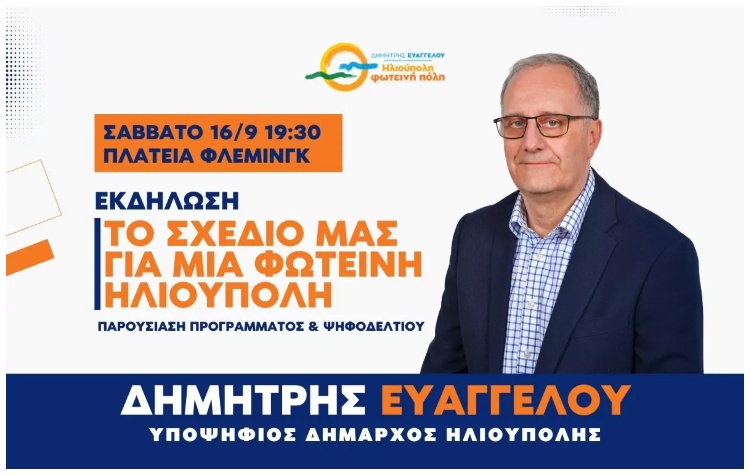 Κάλεσμα στους κατοίκους της Ηλιούπολης να δώσουν το παρών στην προεκλογική του συγκέντρωση που θα πραγματοποιηθεί το επόμενο Σάββατο 16 Σεπτεμβρίου στην πλατεία Φλέμινγκ απευθύνει ο υποψήφιος δήμαρχος της πόλης και επικεφαλής της παράταξης «Ηλιούπολη, Φωτεινή Πόλη», Δημήτρης Ευαγγέλου.