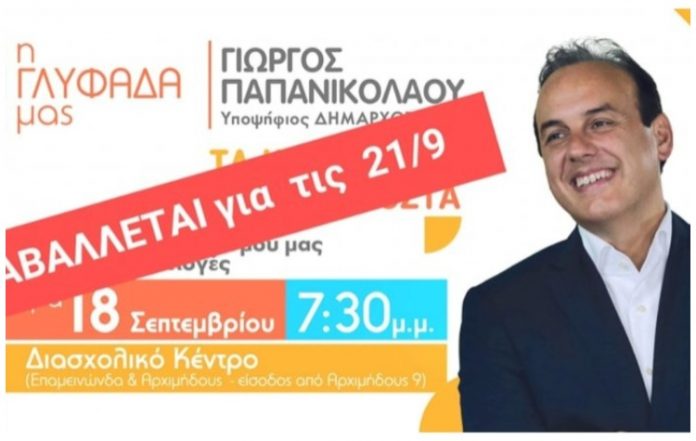Αναβάλλεται για την Πέμπτη, 21 Σεπτεμβρίου η προγραμματισμένη προεκλογική συγκέντρωση του δημάρχου Γλυφάδας Γιώργου Παπανικολάου, λόγω συμμετοχής στο τριήμερο πένθος στις Ένοπλες Δυνάμεις για τον θάνατο των πέντε στρατιωτικών στη Λιβύη όπου βρίσκονταν για να παρέχουν ανθρωπιστική βοήθεια.