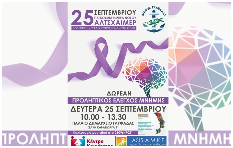 Δωρεάν διαγνωστικός έλεγχος για την πρόληψη της νόσου Αλτσχάιμερ θα πραγματοποιηθεί και φέτος στις 25 Σεπτεμβρίου στο Π. Δημαρχείο της Γλυφάδα με πρωτοβουλία της δημοτικής Αρχής και την συνεισφορά του Κέντρου Ημέρας IASIS της IASIS AMKE.
