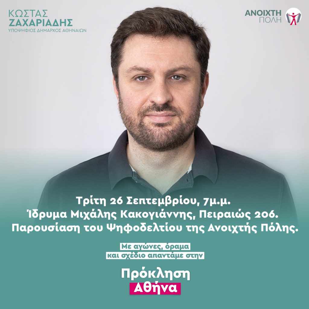 Η Ανοιχτή Πόλη και ο υποψήφιος δήμαρχος Αθηναίων Κώστας Ζαχαριάδης σας προσκαλούν στην παρουσίαση του ψηφοδελτίου της παράταξης, αύριο Τρίτη 26 Σεπτεμβρίου στις 7:00μμ, στο Ίδρυμα Μιχάλης Κακογιάννης, Πειραιώς 206.
