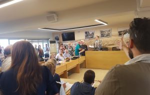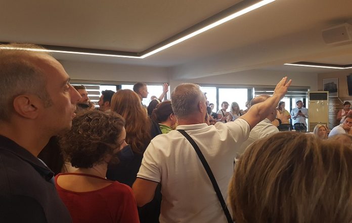 Στην κατάμεστη αίθουσα του Δημοτικού Συμβουλίου (είχαν συγκεντρωθεί δεκάδες γονείς και εκπαιδευτικοί οι οποίοι επέρριψαν ευθύνες στη Δημοτική Αρχή για το λουκέτο κατηγορώντας τη για κωλυσιεργία και λανθασμένες κινήσεις) η ένταση ήταν τόσο μεγάλη, που λίγο έλειψε να πιαστούν στα χέρια ο πρόεδρος του Δημοτικού Συμβουλίου Παναγιώτης Τσιάπης με έναν εκ των συγκεντρωμένων ο οποίος τον απείλησε ότι θα του ρίξει γιαούρτι. Η κατάσταση «μαλάκωσε» λίγο με τη βοήθεια στελεχών της Δημοτικής Αρχής, οι οποίοι συγκράτησαν τον κ. Τσιάπη ενώ όρμησε σαν μαινόμενος ταύρος προς την πλευρά του άνδρα που τον είχε απειλήσει με «γιαούρτωμα».