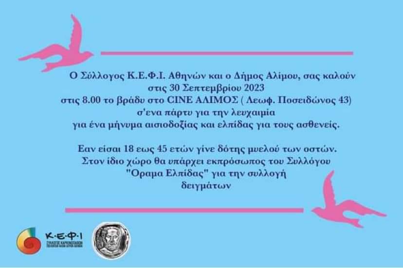 Με στόχο την ευαισθητοποίηση του κόσμου για την λευχαιμία ο Σύλλογος Κ.Ε.Φ.Ι Αθηνών και ο Δήμος Αλίμου διοργανώνουν το Σάββατο 30 Σεπτεμβρίου στις 20.00 στο Cine Άλιμος μία εκδήλωση, μέσω της οποίας οι διοργανωτές φιλοδοξούν να στείλουν το δικό τους μήνυμα ελπίδας και αισιοδοξίας στους ασθενείς.