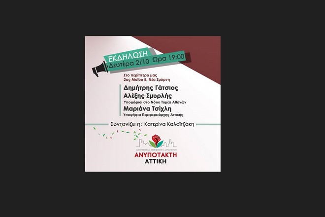 Ανοιχτή εκδήλωση – συζήτηση εν όψει την περιφερειακών εκλογών διοργανώνει ο συνδυασμός Ανυπότακτη Αττικής την Δευτέρα 2/10 στις 19:00 στο εκλογικό περίπτερο στη Νέα Σμύρνη, στην οδό 2ας Μαΐου 8.