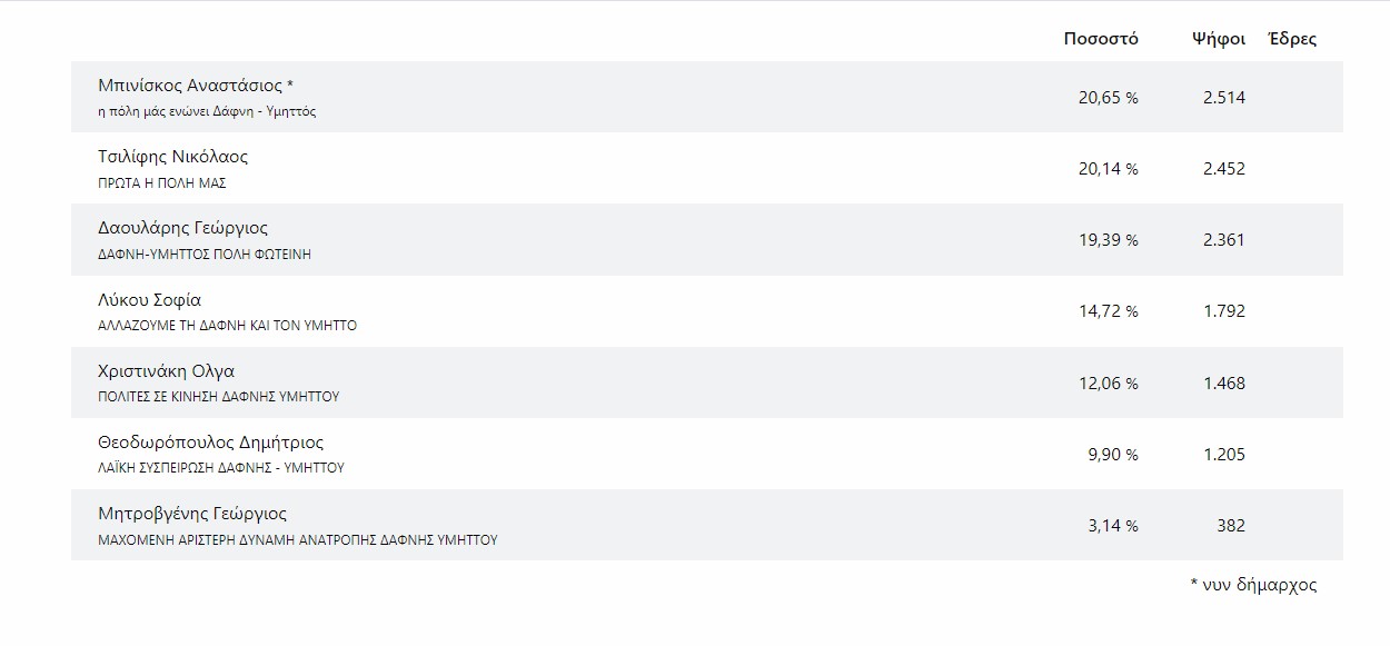 Θρίλερ για… γερά νεύρα παίζεται στον Δήμο Δάφνης – Υμηττού, όπου η σειρά των τριών υποψηφίων άλλαζε διαρκώς καθ’ όλη τη διάρκεια της εκλογικής βραδιάς. Ο δήμαρχος Δάφνης Υμηττού, Τάσος Μπινίσκος, ναι μεν ήρθε πρώτος (20,65%), αλλά οριακά από τον δεύτερο, Νίκο Τσιλίφη (20,14%) και τον τρίτο Γιώργο Δαουλάρη (19,39%). οπότε ουδείς γνωρίζει μέχρι τώρα (ξημερώματα Δευτέρας) πως θα διαμορφωθεί.