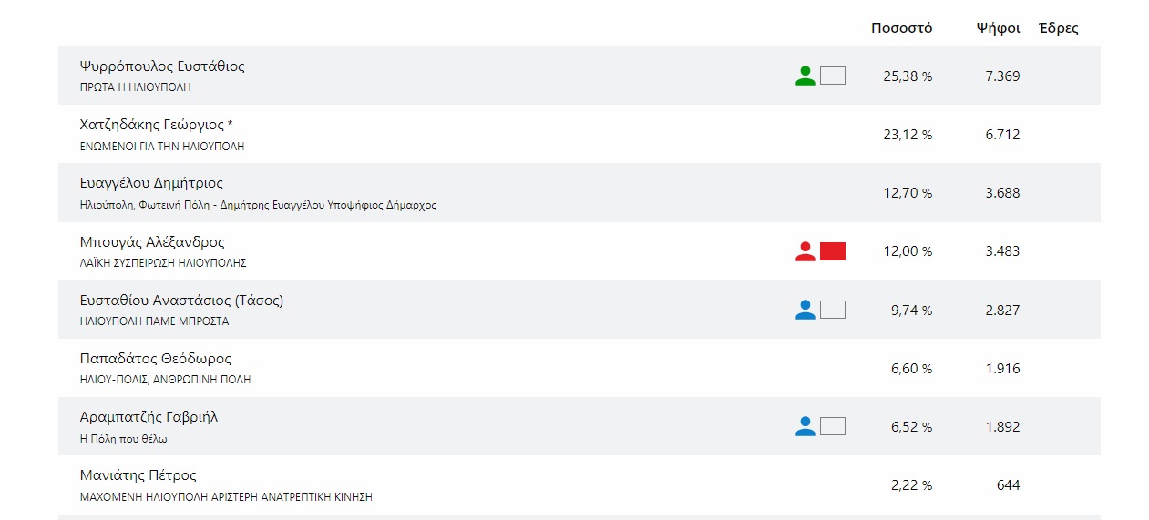 Δύσκολες ώρες περνά στην Ηλιούπολη ο δήμαρχος Γιώργος Χατζηδάκης, ο οποίος ήρθε δεύτερος (με 23,12%) αλλά σε απόσταση αναπνοής από τον πρώτο, Στάθη Ψυρρόπουλο (25,138%). Οι δύο άνδρες δίνουν νέο ραντεβού την Κυριακή 15 Οκτωβρίου.