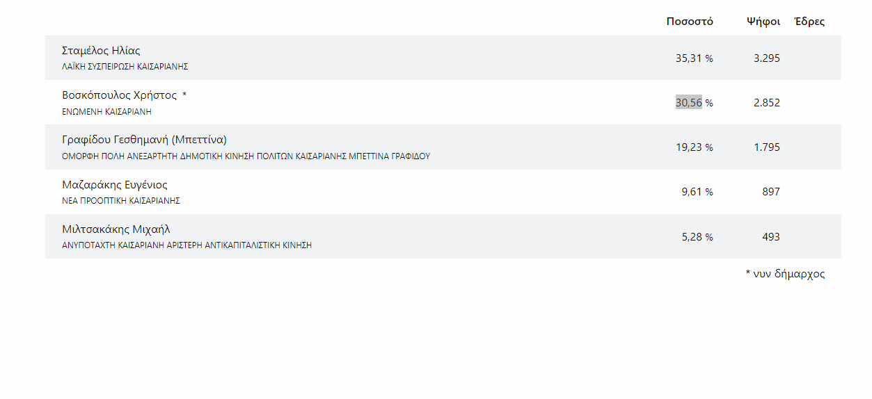 Ομοίως και ο δήμαρχος Καισαριανής, Χρήστος Βοσκόπουλος, ο οποίος ήρθε δεύτερος με ποσοστό 30,56% από τον Ηλία Σταμέλο (35,31%).