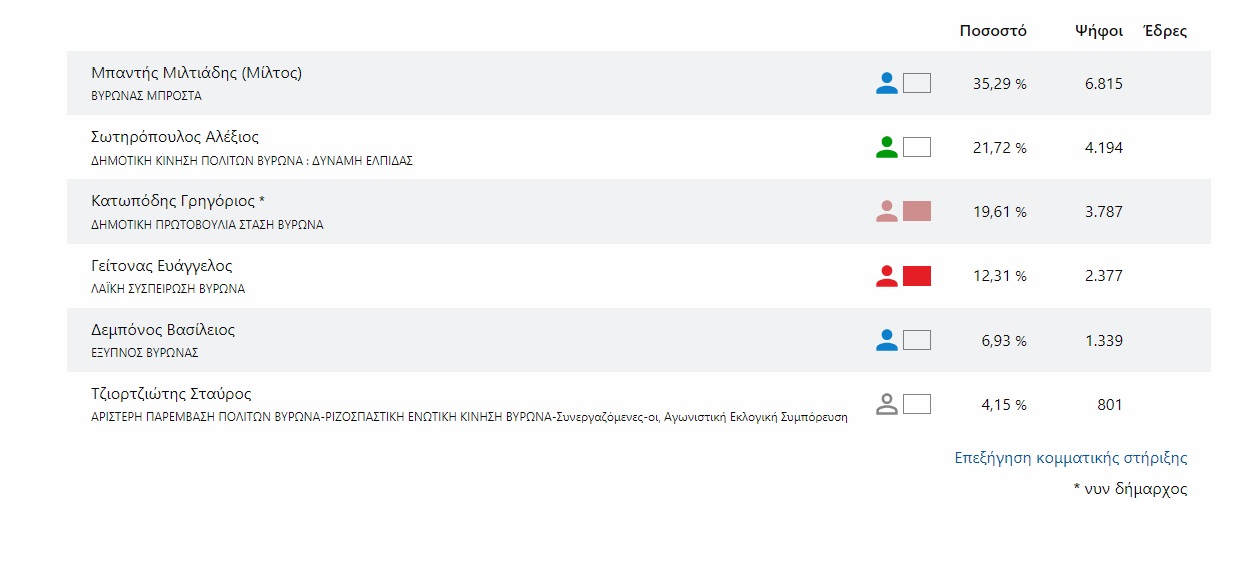 Στον Βύρωνα, ο δήμαρχος Γρηγόρης Κατωπόδης, υπέστη επίσης μεγάλη ήττα, καθώς μετά από δύο θητείες δεν καταφέρνει να πάει σε δεύτερο γύρο εκλογών. Την Κυριακή 15 Οκτωβρίου, θα αναμετρηθούν ο Μίλτος Μπαντής ο οποίος υποστηρίζεται από τη ΝΔ και ήρθε πρώτος με 35,29% και ο Αλέξης Σωτηρόπουλος (21,72%) που στηρίζεται από το ΠΑΣΟΚ.