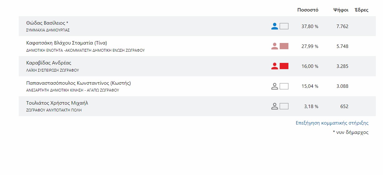 Στο Δήμο Ζωγράφου ο δήμαρχος Βασίλης Θώδας πρώτευσε με ποσοστό 37,80 με δεύτερη την Τίνα Κατσαφάκη με 27,99%.