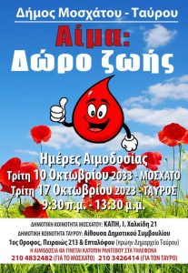 Για 2η φορά μέσα σε λίγες μόλις μέρες ο Δήμος Μοσχάτου – Ταύρου διοργανώνει σήμερα Τρίτη 17 Οκτωβρίου εθελοντική αιμοδοσία για την ενίσχυση της Δημοτικής Τράπεζας Αίματος.