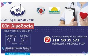 Την 80η του εθελοντική αιμοδοσία διοργανώνει ο Δήμος Παλαιού Φαλήρου σε συνεργασία με τους γιατρούς και το προσωπικό του Κέντρου Αιμοδοσίας του Ασκληπιείου Βούλας το Σάββατο 4 Νοεμβρίου.