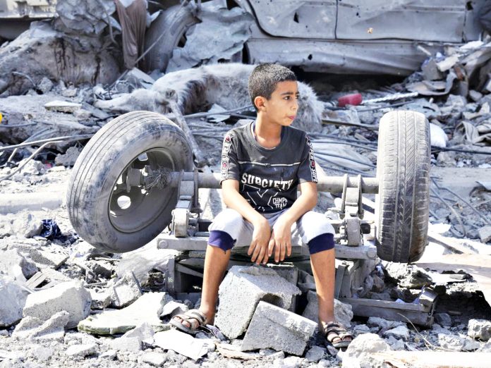 Όμως, αυτή η απλή φράση πνιγόταν και χανόταν και έσβηνε κάθε τόσο στα αναφιλητά, στους γκρίζους καπνούς, στη σκόνη και στις λάσπες, αλλά και στα μουτζουρωμένα δάκρυα του μικρού αγοριού που ασταμάτητα αυλάκωναν το χλωμό του πρόσωπο. Σήκωνε ψηλά στον ουρανό, σε στάση προσευχής και ικεσίας τα δυο του χέρια που τρεμούλιαζαν και λύγιζαν, καθώς οι πληγές από τα θραύσματα των όπλων του πολέμου ήταν ακόμα νωπές και αιμορραγούσαν τυλιγμένες με βρώμικα κουρέλια. Το παιδί χαμένο σ’ έναν δικό του ανατριχιαστικό φόβο, επαναλάμβανε την ίδια πονεμένη φράση, που δυστυχώς κανείς ούτε την πρόσεχε ούτε ήθελε να την ακούσει: «Εμείς δεν κάναμε τίποτα κακό…»