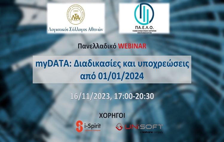 Ο ΛΟΓΙΣΤΙΚΟΣ ΣΥΛΛΟΓΟΣ ΑΘΗΝΩΝ (Λ.Σ.Α) και η Πανελλήνια Ένωση Λογιστών Οικονομολόγων (Π.Α.Ε.Λ.Ο.) διοργανώνουν από κοινού την Πέμπτη16/11/2023, από τις 17:00 – 20:30 Πανελλαδικό Webinar για τις εξελίξεις στην myDATA αναλύοντας αυτά που θα ισχύσουν άμεσα, όπως αναφέρονται και στο νέο Φορολογικό Νομοσχέδιο που είναι για διαβούλευση την 01/01/2024.