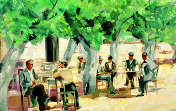 Στη μέση μιας πλατείας, ένας μεγάλος πλάτανος, που τα καλοκαίρια τη σκεπάζει ολόκληρη με μεγάλα φύλλα. Κάτω από τον ίσκιο του, καρέκλες και μικρά τραπέζια. Σε ένα τραπέζι δυο άντρες παίζουν τάβλι. Τα ζάρια αλλάζουν χέρια κάνοντας χαρακτηριστικό ήχο. Δίπλα από το ξύλινο τάβλι δύο γυάλινα ποτήρια με ούζο και ένας μικρός μεζές. Κάπου αλλού, κοντά σε θάλασσα, οι καρέκλες βαμμένες γαλάζιες κάτω από μια μουριά. Εικόνες Ελλάδας που συχνά απεικονίζονταν σε καρτ-ποστάλ που έγραφαν Greece.