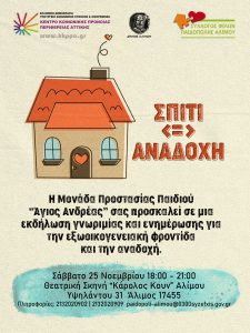 Eκδήλωση με τίτλο “Σπίτι <=> Αναδοχή” διοργανώνουν το Σάββατο 25 Νοεμβρίου στις 18.00, στη Θεατρική Σκηνή “Κάρολος Κουν” στον Άλιμο, η Μονάδα Άγιος Ανδρέας μας και το Κέντρο Κοινωνικής Πρόνοιας Περιφέρειας Αττικής, σε συνεργασία με τον Σύλλογο Φίλων της Παιδόπολης Άγιος Ανδρέας και την υποστήριξη του Δήμου Αλίμου.