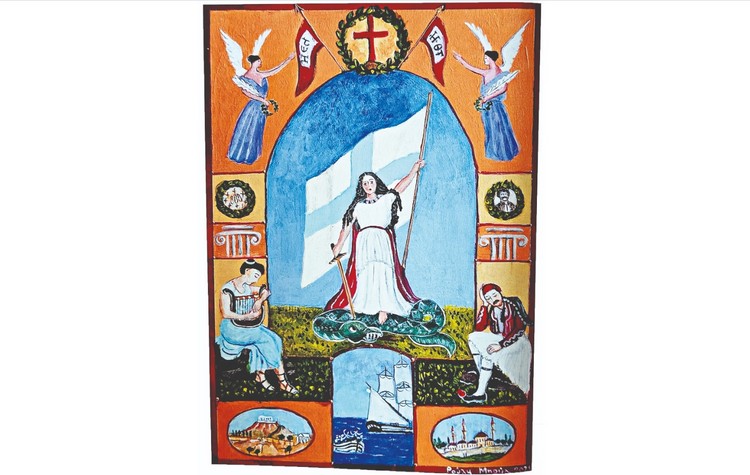 Και άλλα θέματα του πίνακα 90 δεν ανήκουν στην εικονογράφο˙ έτσι ο κόκκινος σταυρός σε στεφάνι με δύο σημαίες στο πλάι του παραπέμπει στη σημαία του Σισίνη με τα σύμβολα της Φιλικής Εταιρείας 9. Στις σημαίες γράφονται συντομογραφικά η ΕΛ (Η Ελευθερία) και η ΘΤ (=Η θάνατος). Από τη σημαία του Σισίνη, δεν αντιγράφεται από τη Ρ. Μπούα ο ιερός δεσμός με τις δεκαέξι στήλες που συνδέονται μεταξύ τους, με ταινίες σε χιαστί διάταξη (εικ. 6).