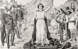 Από το πρώτο έργο του Χρηστίδη, η ζωγράφος Ρούλη Μπούα αντλεί τη μορφή της Αναγέννησης, για να αποδώσει την Ελευθερία της στροφής 90. Την Αναγέννηση στη λιθογραφία πλαισιώνουν δύο όμιλοι: στα αριστερά ο όμιλος των στρατιωτών και στα δεξιά ο όμιλος του λαού. Στην αριστερή ομάδα αναγράφεται η επιγραφή: ΖΗΤΩ Ο ΣΤΡΑΤΟΣ και στην άλλη ΖΗΤΩ Ο ΛΑΟΣ 4.