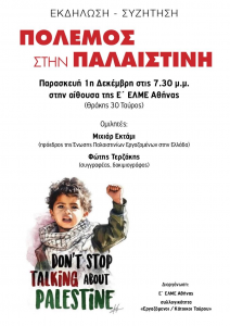 Με αφορμή τον πόλεμο στην Λωρίδα της Γάζας η Ε’ ΕΛΜΕ Αθήνας και η Συλλογικότητα “Εργαζόμενοι/Κάτοικοι Ταύρου” διοργανώνουν την Παρασκευή 1η Δεκεμβρίου, στις 19:30 στον Ταύρο, εκδήλωση – συζήτηση σχετικά με τον πόλεμο στην Παλαιστίνη.