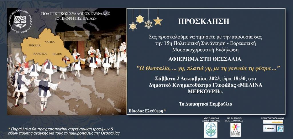 Πολιτιστικό αφιέρωμα στη Θεσσαλία για την στήριξη των κατοίκων της περιοχής που επλήγησαν από την φονική κακοκαιρία, διοργανώνει το Σάββατο 2 Δεκεμβρίου στο Δημοτικό Κινηματοθέατρο “Μ. Μερκούρη” ο Δήμος Γλυφάδας.