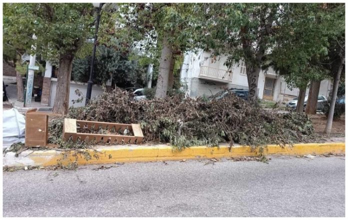 Πέραν των σκουπιδιών, ακόμη οι δρόμοι είναι γεμάτοι από τα κλαδιά των δέντρων που προ μηνός κλαδεύτηκαν από τις υπηρεσίες του Δήμου.