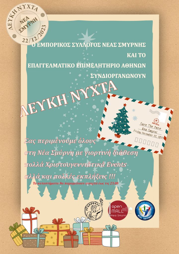 Στις 22 Δεκεμβρίου θα πραγματοποιηθεί η “Λευκή Νύχτα” στην Νέα Σμύρνη, μία βραδιά που συνδιοργανώνουν ο Eμπορικός Σύλλογος Νέας Σμύρνης και το Επαγγελματικό Επιμελητήριο Αθηνών.