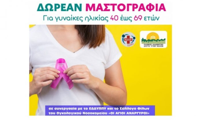 Συγκεκριμένα, η δημοτική Αρχή της πόλης, σε συνεργασία με το Ελληνικό Διαδημοτικό Δίκτυο Υγιών Πόλεων και τον Σύλλογο Φίλων Ογκολογικού Νοσοκομείου «Οι Αγ. Ανάργυροι», θα προβούν στην διενέργεια δωρεάν μαστογραφιών σε γυναίκες που ανήκουν σε ευπαθείς ομάδες.
