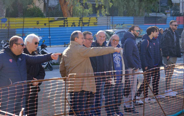 Ο Γ. Κουτελάκης μαζί με τον αντιδήμαρχο Αθλητισμού, Θόδωρο Καστόρη, και τον επί σειρά ετών πρόεδρο του Δημοτικού Συμβουλίου, Παναγιώτη Τσιάπη, υποδέχθηκαν τους παίκτες και τα στελέχη της ομάδας και συζήτησαν για το φλέγον θέμα της αποπεράτωσης του Γηπέδου, εκεί που άλλοτε δέσποζε το ιστορικό «κλειστό» της Νέας Σμύρνης.