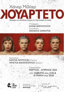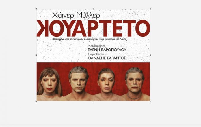 Η θεατρική παράσταση με τίτλο “Κουαρτέτο” του Χάινερ Μίλλερ (Heiner Muller), κάνει πρεμιέρα το Σάββατο 2 Μαρτίου και κάθε Σάββατο στις 21:00 και Κυριακή στις 20:00 για 20 μόνο παραστάσεις στο Θέατρο Από Μηχανής (Ακαδήμου 13, Αθήνα).